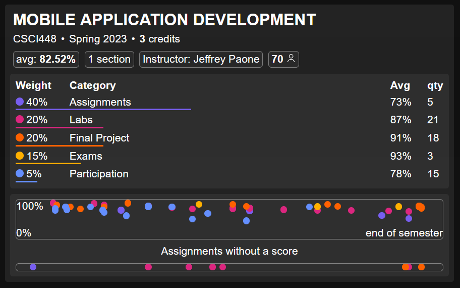 A platform for data driven course selection. The site shows average grades on a per course, and per assignment level, and is designed to help students choose classes that match their learning style.